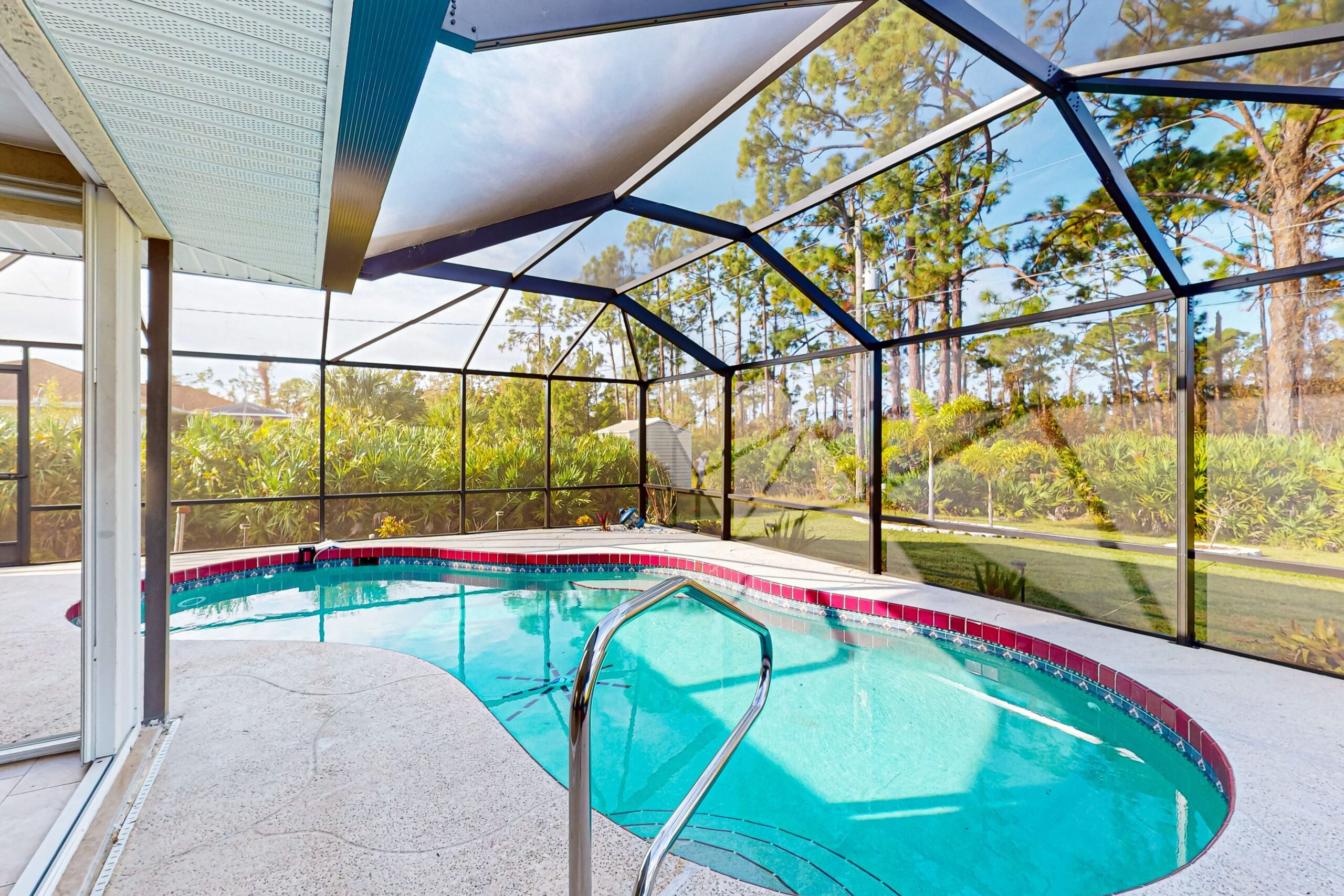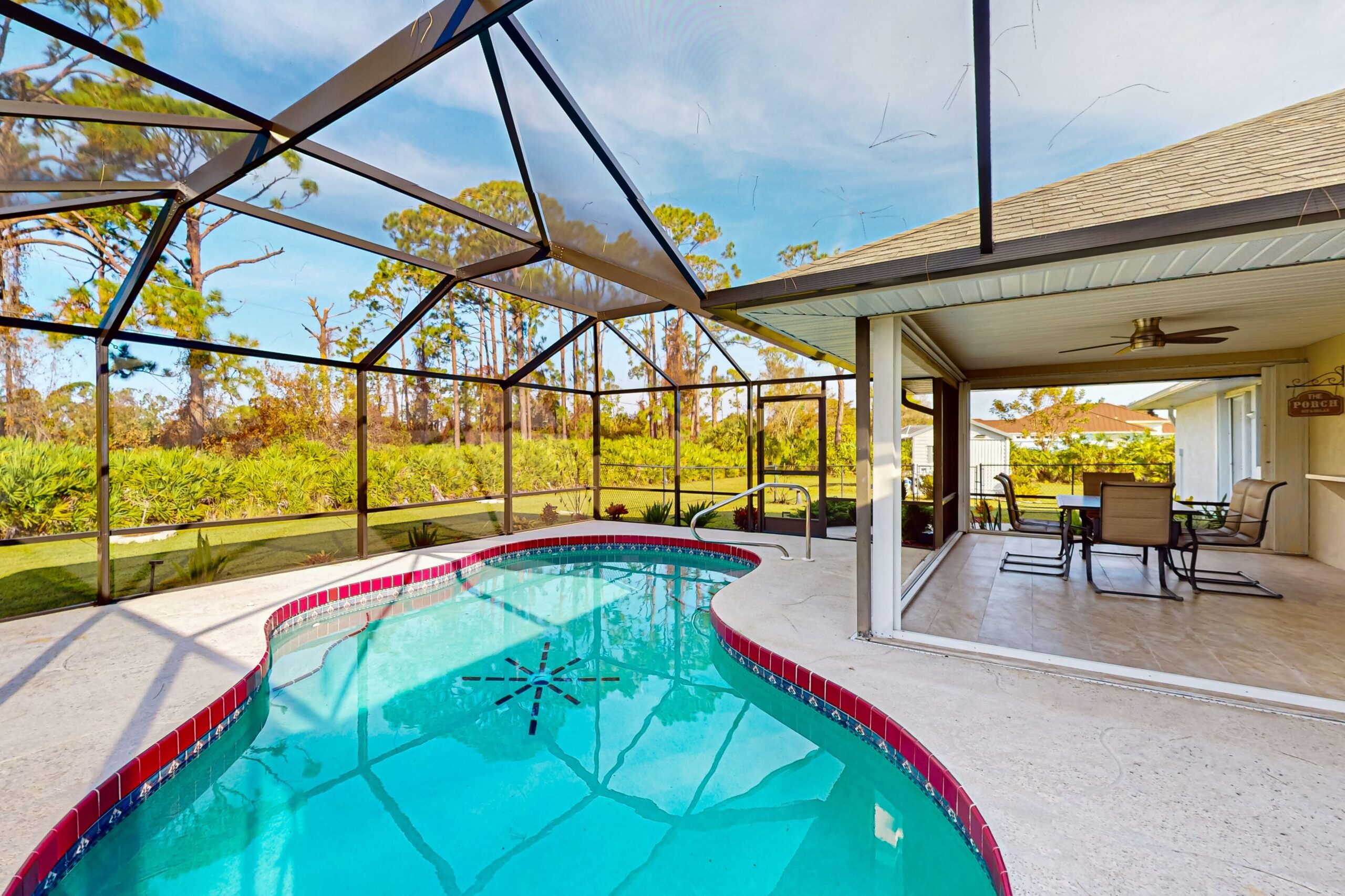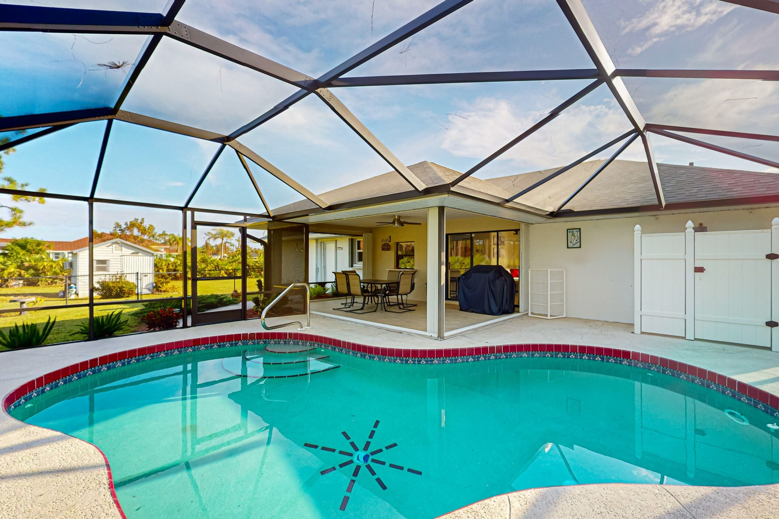 Escape to this delightful pool home in Port Charlotte, FL, where you can relax and unwind in a beautifully maintained space with a sparkling heated pool and a large fenced yard perfect for family fun. The lanai offers a private oasis, surrounded by lush landscaping and providing a serene setting for your vacation retreat.
